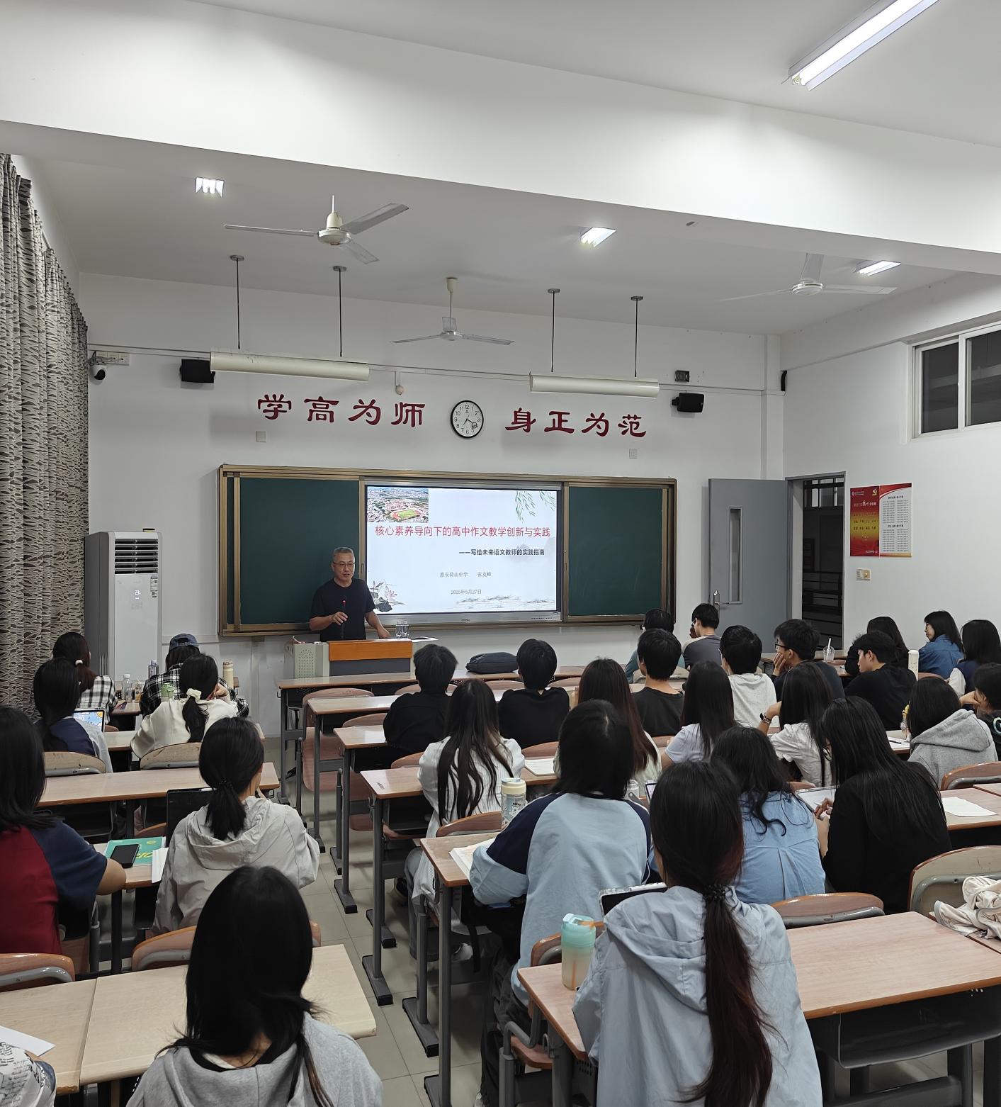 5月27日傍晚,在俊秀东楼306教室,荷山中学张友峰老师为中文学子带来一场聚焦高中作文教学创新与实践的学术讲座。讲座由中文系教师陈琼莲主持。