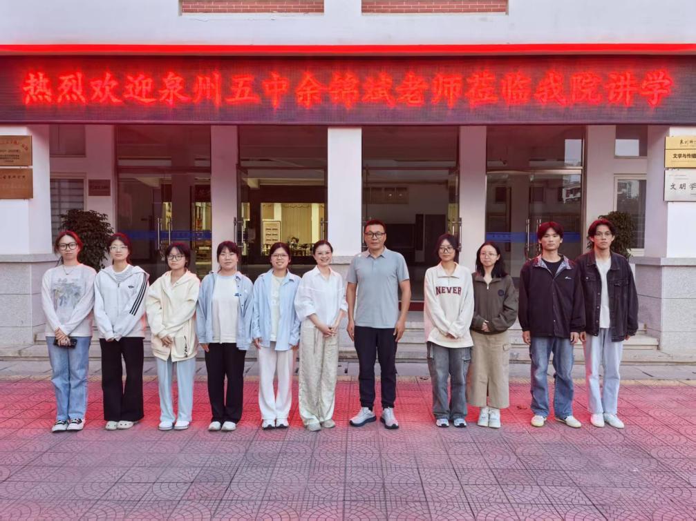为进一步提升师范生专业素养,充分发挥一线教师引领示范作用,落实本专业就业指标要求,我院积极开展名师进校系列讲座。5月26日下午,泉州五中余锦斌老师受邀入校,在荣茂楼401教室带来《“里面自有法”——教育强国背景下中学语文师范生教学能力提升策略分析》的专题讲座。讲座由学科教学语文骨干教师陈琼莲主持。
