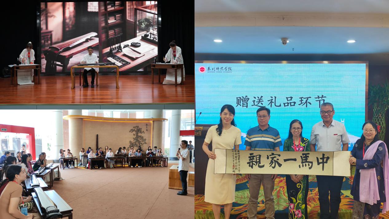 研学活动全程融合五雅文化。开班仪式上,《墨香琴韵》特色节目中,潘贤杰老师现场奏古琴曲《流水》,书法专业党员学生在悠扬琴音中挥毫写对联,以传统文化创新表达奠定文化交融基调;核心课程《古琴文化与实践》,潘贤杰老师与学生第三党支部党员共同授课,通过口诀强化指法、详解减字谱,结合《静夜思》引导学员弹唱互动,实现情感共鸣;结业仪式上,党员教师王一言书写“中马一家亲”书法作品赠予马方教师,串联“书”“琴”“诗”元素,更成为学院五雅文化党建实践的生动注脚。