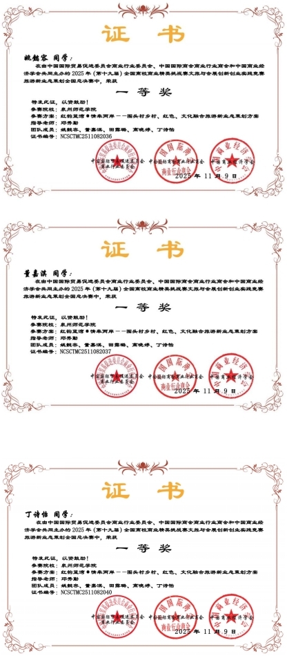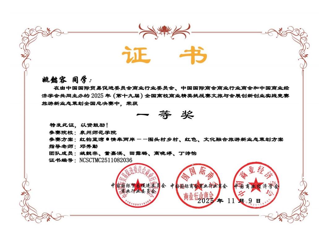 11月21日至24日,第十九届全国高校商业精英挑战赛文旅与会展创新创业实践竞赛全国总决赛精英赛在浙江金华永康隆重举行,姚懿容、丁诗怡、董嘉淇等同学到现场参加总决赛。作品《红韵蓝湾·情牵两岸——围头村乡村、红色、文化融合旅游新业态策划方案》斩获全国一等奖,并入围2026年国际文旅与会展大赛。该作品围绕“围头村”乡村文旅融合创新发展展开策划,由22级广告学(闽台合作)专业姚懿容同学、23级广告学(闽台合作)丁诗怡、董嘉淇同学共同参与创作完成。