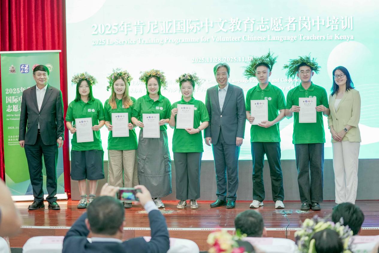 2025年11月30日,在肯尼亚内罗毕大学孔子学院举行的“2025年肯尼亚国际中文教育志愿者岗中培训”结业仪式上,我院三名学生——熊舒婷、朱晋佑、梁梓卓,受到教育部中外语言交流合作中心(以下简称“语合中心”)主任郁云峰先生的亲切接见,体现了国家对国际中文教育青年实践力量的高度重视,也是我院深化人才培养国际化、服务国家语言文化传播战略的生动缩影。