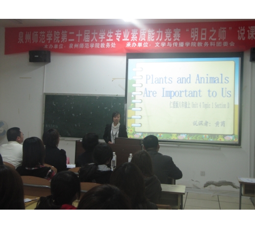 选手们通过围绕说教材、说教法、说学法、说教学过程和板书设计说明等内容并辅助多媒体课件来阐述自己独特的授课理念。在比赛过程中,选手们展示了自己出色的专业素质,良好的教师品质以及大学生阳光自信的精神风貌。经过激烈的角逐,我院2008级黄茵同学在赛场上幽默诙谐地演绎了课文《Plants and animals are important to us》,最终仅以0.1分之差位列第二。而我院2010级杜小钦同学则以初生牛犊不怕虎之势冲出重围排名第五。