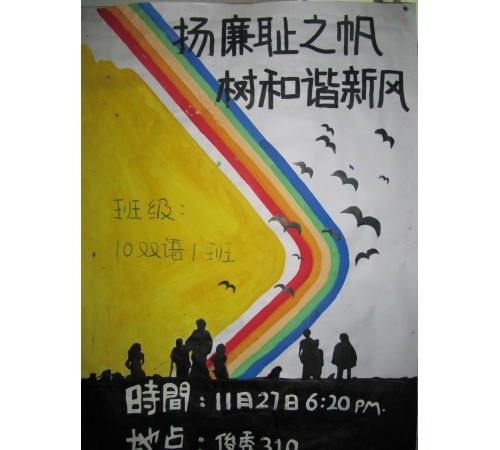 班会活动中,2009级英教三班的同学们从微关注的角度,形象的体现“和煦廉风拂校园,浩然正气系你我”的主题,更有同学以刚劲有力的笔锋,书写对廉洁的崇尚之情;2010级双语一班的同学们通过小品的形式演绎了“扬廉耻之帆,树和谐新风”的主题;而2010级英教三班的同学则是以激烈的抢答方式,使同学们在紧张却不失愉悦的环境下牢记“崇廉尚洁”的相关知识,讨论激烈却又不乏欢声笑语,现场气氛活跃。