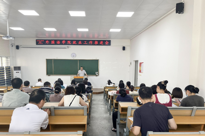 7月8日周六上午,学院在112教室召开2023届毕业生就业工作推进会,传达贯彻学校毕业生就业工作推进会精神,就推进学院毕业生就业工作进行再强调、再部署、再落实。院领导、英语专业和商务英语专业全体教师、全体行政人员参加了会议。会议由蒋双霖书记主持。