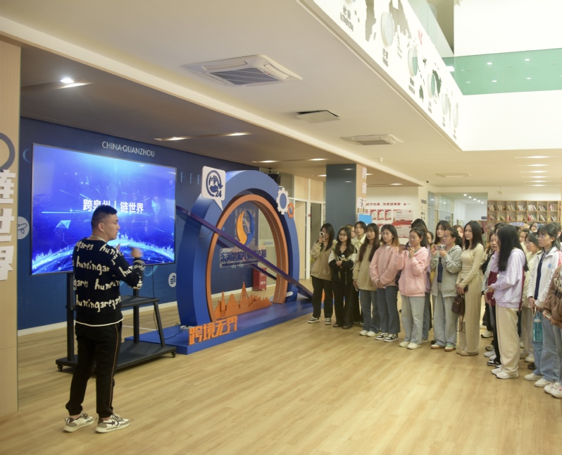 活动初期,基地的负责人为同学们详细地介绍东海跨境电商生态圈,并展示东海湾产教融合实训基地公共服务平台的相关信息;见习中期同学参观了蓝鲸、策跃等多个产教融合型企业。最后,泉州市图森科技有限公司的张择斌先生为同学们作了主题讲座《人工智能AI在跨境电商中的应用》,阐述了跨境电商企业紧跟时代发展,构建“AI+”体系,为企业节省成本,为消费者提供更高品质的服务。