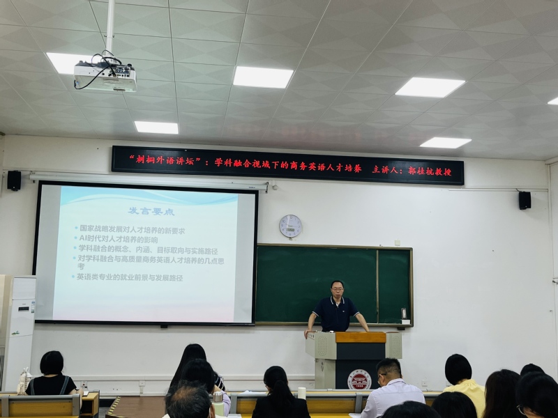 为强化学院人才培养成效,2024 年11月15日,应外国语学院邀请,广东外语外贸大学南国商学院郭桂杭副校长在外112教室举办“学科融合视域下的商务英语人才培养”专题讲座。外国语学院师生参与听讲。