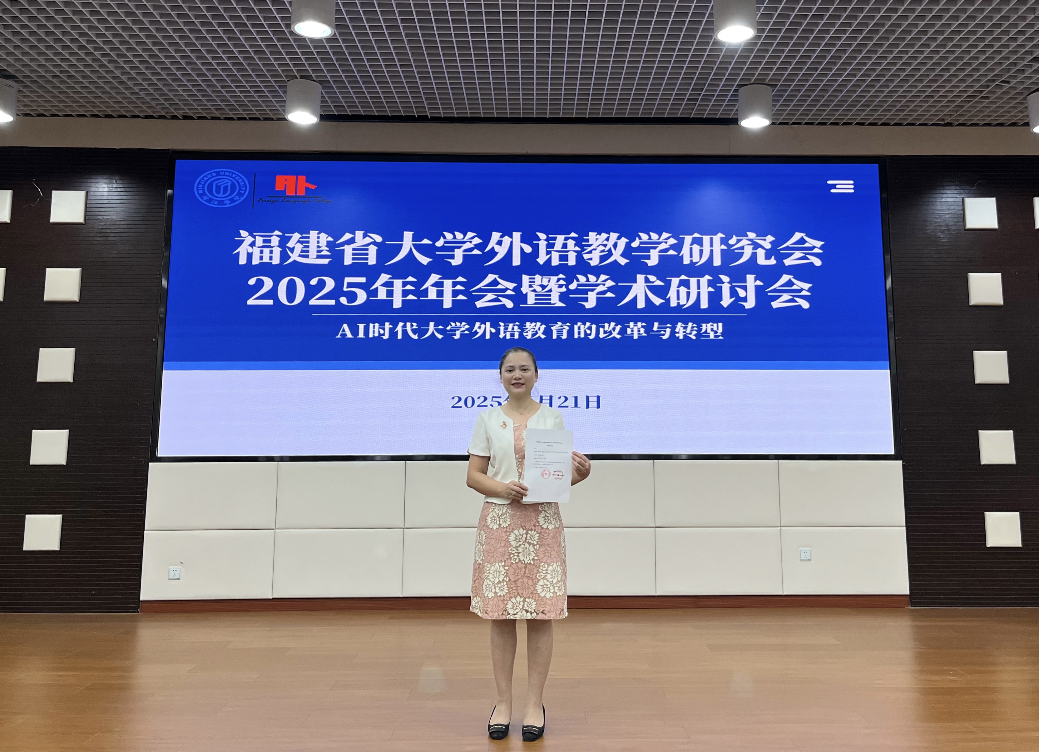 近日,福建省大学外语教学研究会 2025 年年会暨学术研讨会在闽江学院圆满落幕。外国语学院教师党员陈雅婷撰写的论文《数智赋能大学英语自适应学习与思政育人协同机制研究》,经专家评审团多轮评议和层层筛选,凭借前沿的研究视角、扎实的理论架构及突出的实践价值脱颖而出,荣获年会“优秀论文”称号。