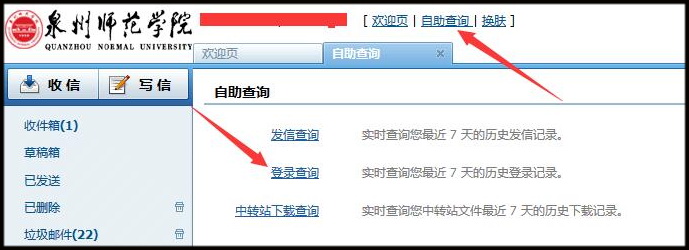 三、定期检查邮箱状况。各用户须经常登录自己的邮箱,检查邮箱使用情况,如发现异常登录,应及时修改密码。检查方法:点击“自助查询”,“登录查询”,如果登录成功的IP地址为非本人所处区域,就可能邮箱被盗用了。网络中心已关停超过一定时间未登录的邮箱账号,如还需使用,请联系网络中心解锁。