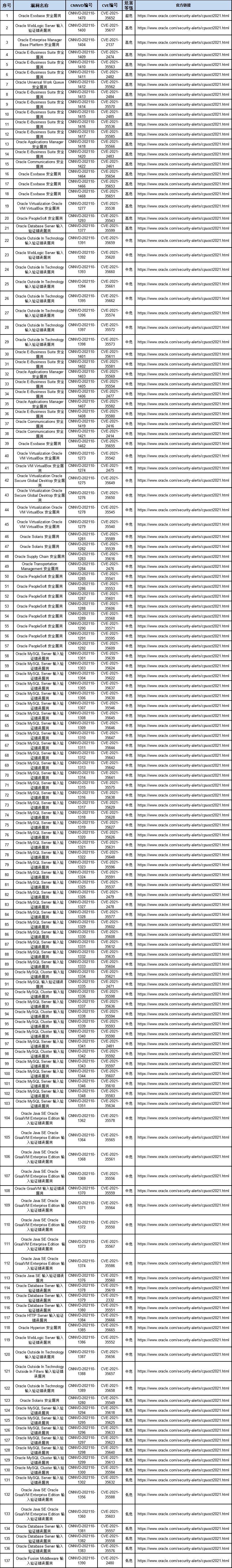 2021年10月19日,Oracle官方发布了2021年10月份安全更新,共137个漏洞的补丁程序,CNNVD对这些漏洞进行了收录。本次更新主要涵盖了Oracle Mysql和Mysql 组件、Oracle Hyperion、Oracle Java SE Oracle GraalVM Enterprise Edition、Oracle VM VirtualBox、Oracle Transportation Management、Oracle Java SE等。CNNVD对其危害等级进行了评价,其中超危漏洞1个,高危漏洞20个,中危漏洞101个,低危漏洞15个。Oracle多个产品和系统版本受漏洞影响,具体影响范围可访问https://www.oracle.com/security-alerts/cpuoct2020.html查询。