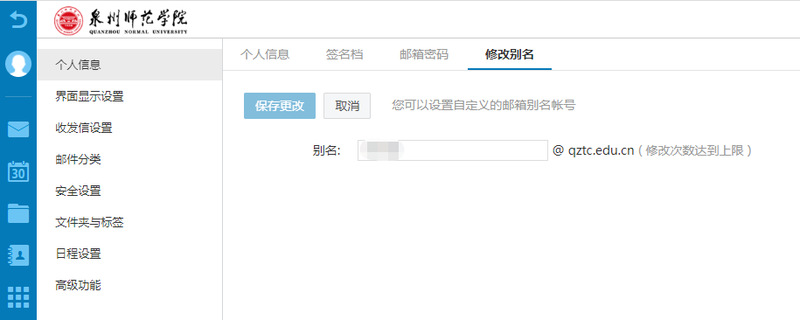 3. 新用户以工号名登录邮箱后,可以通过“个人信息”中“修改别名”功能,为邮箱设置个性化别名邮箱。