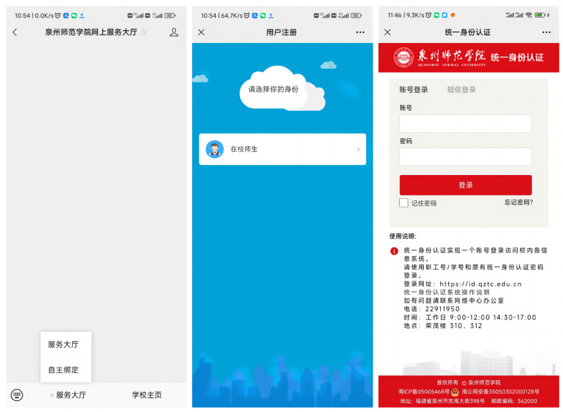 2.首次登录需进行绑定,请点击公众号里的“自主绑定”,登录学校统一身份认证[注1]进行身份绑定。