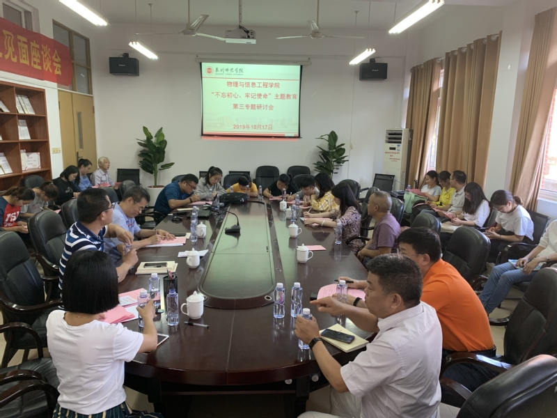 2019年10月17日下午,在前面自学的基础上,我院在理工楼208会议室召开“不忘初心、牢记使命”主题教育第三专题研讨会暨征求师生党员意见会。学院全体师生党员参加会议,校主题教育巡回指导组黄桂程同志莅临指导。