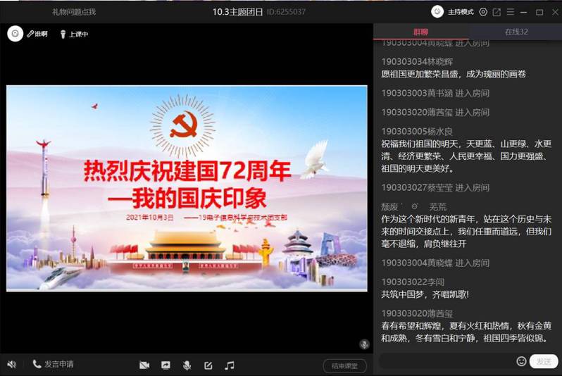 同学们围绕“请党放心 强国有我”主题,集体观看纪录电影《1950他们正年轻》片段,结合所学历史知识,纷纷抒发自身的感受和体会。各宿舍围绕文明宿舍创建活动要求积极行动起来,整理卫生,收拾床铺,养成良好的行为习惯,以高度的思想自觉和行动自觉投入文明宿舍创建活动中。院团委组织各团支部开展“我的国庆印象”线上主题分享会,同学们积极连线,畅所欲言,表达自己对伟大祖国浓厚的情感。
