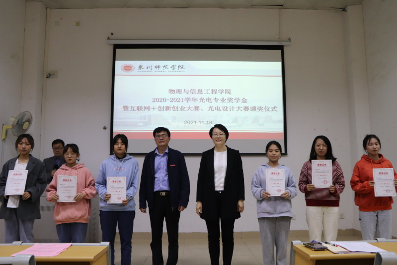 11月18日下午,我院在理工218教室举行2021年光电信息科学与工程专业奖学金暨学科竞赛获奖团队奖励金颁发仪式。院长、党委书记杨惠山,院党委副书记、纪委书记洪荣文,院党委副书记吴丽双,副院长陈木生、陈慧彬,科室负责人、辅导员、光电专业全体师生和学科竞赛获奖团队代表参加,本次活动由洪荣文主持。