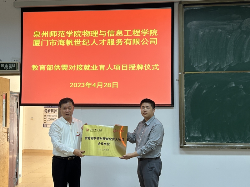 2023年4月28日下午,我院与厦门市海帆世纪人才服务有限公司合作的“教育部供需对接就业育人项目”授牌仪式在理工楼218教室举行,厦门市海帆世纪人才服务有限公司副总经理张家伟、总经理助理于亚雯、物信学院党委副书记兼纪委书记洪荣文、辅导员和部分学生代表参加。