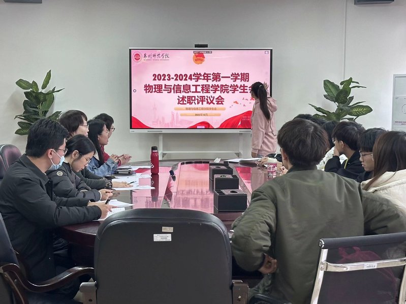 为加强我院学生会工作人员队伍建设,增强学生会干部服务水平,2023年12月21日下午,我院在理工208会议室召开2023-2024学年第一学期学生会成员述职评议会。学院党委书记吴丽双、学院团委老师、学生会成员参加此次会议。