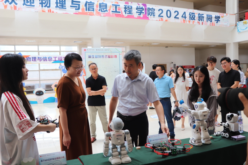 我院展示学生优秀获奖科技作品,设计者们详细讲解无人机、机器人、智能循迹小车和3D打印样品等作品的创作过程和设计理念。校长陈昌萍莅临现场指导,对展品给予高度评价,并对新生们寄予厚望,鼓励他们积极投身科技创新活动,激发他们对专业的兴趣和热爱。
