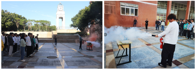 师生们安全撤离到中山广场后,保卫部洪国祥老师向大家介绍了消防器械的技术指标,并演示了如何正确使用消防器械扑灭火焰。现场师生认真观摩学习,并亲自体验灭火的过程:提起灭火器、拔掉保险销、握住软管顶部喷嘴、对准火源根部压下把手,迅速将火苗成功扑灭。