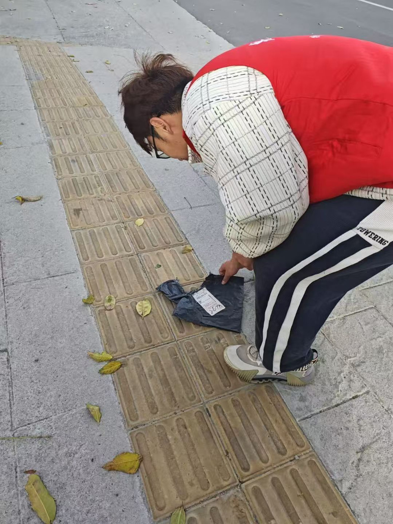 活动当天,志愿者按时集合,分组前往滨海街多个交通繁忙路段和人流密集区域。在现场,志愿者们发现盲道被共享单车、垃圾桶、杂物等侵占的情况较为严重。大家分工明确,有的负责将停放在盲道上的共享单车搬运至指定停车区域,摆放整齐;有的则耐心清理盲道上的垃圾、树枝和其他障碍物,确保盲道的连贯性和畅通性,为视障人士营造安全、畅通的出行环境。