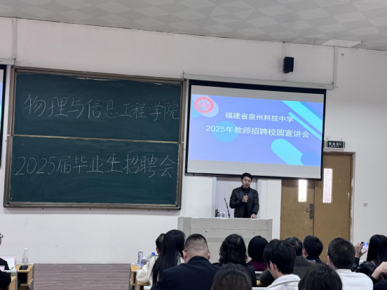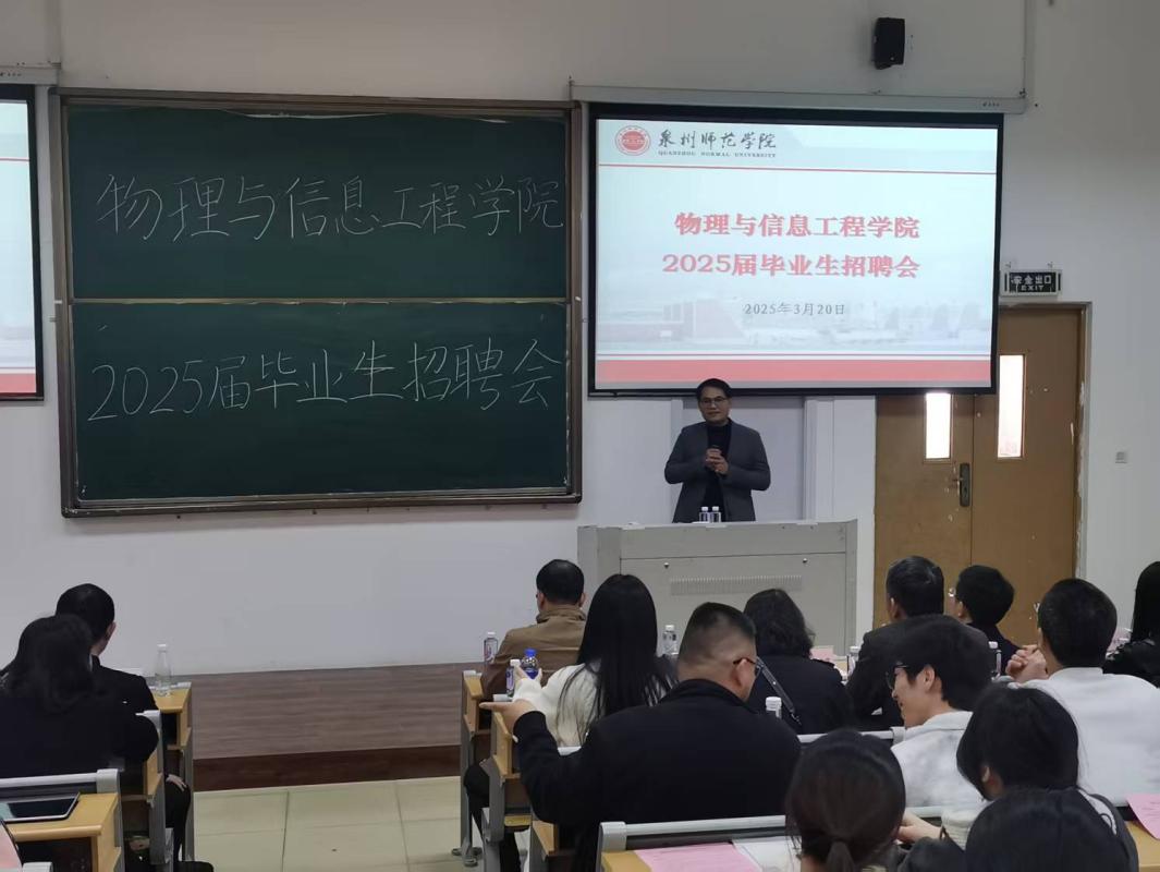 2025年3月20日下午2:30,物理与信息工程学院于理工楼218教室成功举办师范类毕业生专场招聘会(一)。本次招聘会共有泉州实验中学、泉州科技中学、泉州现代中学、泉州中远学校、福清京师学校及晋江市陈埭民族中学六所学校参与。学院教工第二支部书记陈文志主持活动,物理学专业专任教师、辅导员及各专业毕业生共计200余人参加。