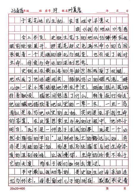 此次分享会以“书香致远,思辨青春”为主题,同学们围绕中华传统经典、红色经典和当代经典等书籍,撰写心得体会并进行书籍介绍与分享。活动现场,精心陈列的读书手札与心得作品成为亮眼风景。七份工整誊写在方格稿纸上的手写读后感,字里行间满是对《我与地坛》《四世同堂》《平凡的世界》等经典著作的深刻感悟,无声诉说着同学们与书籍的深度对话。