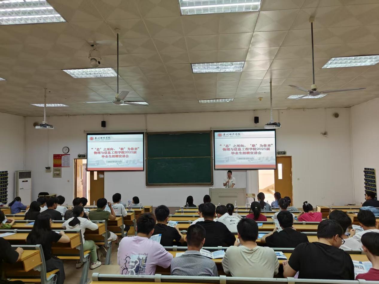 为持续畅通校企对接渠道,搭建学生与企业双向选择桥梁,5月15日下午,我院在理工楼218教室举办“‘芯’之所向、‘职’为你来”2025届毕业生专业实习和招聘宣讲会(二)。本次宣讲会共邀请三家电子信息企业,包括福建火炬电子科技股份有限公司、福建天电光电有限公司和胜科纳米科技(北京)有限公司。泉州半导体高新区人才组成员、学院全体辅导员以及学生代表,共计100余人参加,活动由学院辅导员李国栋主持。