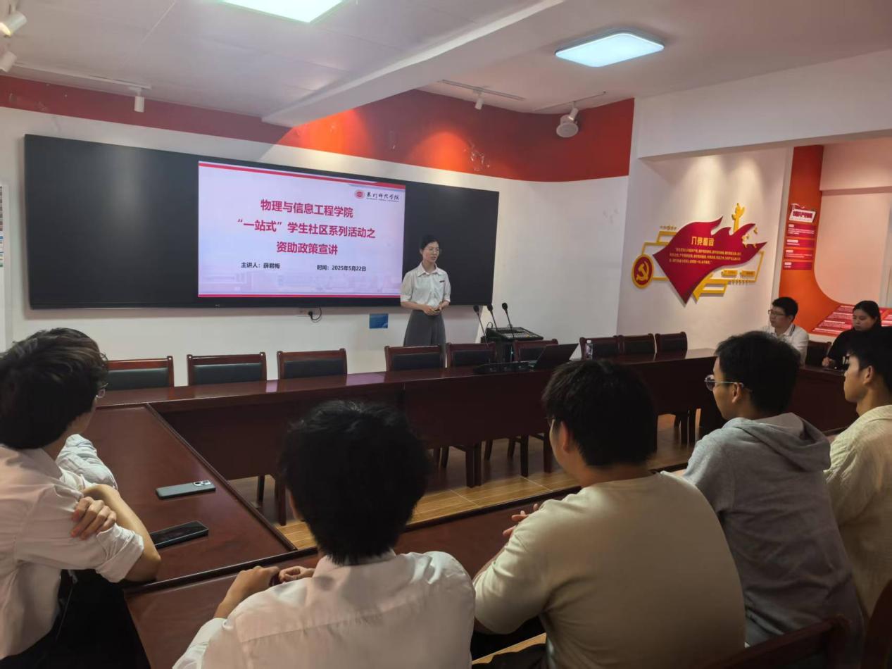 5月22日下午,物理与信息工程学院在学生宿舍C区13栋新时代大学生文明实践中心,举办“一站式”学生社区系列活动——“政策解码・未来启航”资助政策宣讲会。活动聚焦大一、大二班长群体,以资助政策体系为切入点,助力低年级学生通过政策解读明晰大学发展目标,规划个人成长路径。活动由辅导员薛君梅主持,辅导员李国栋和20余名学生代表共同参与,在学生社区中搭建起政策传递与成长对话的双向互动平台。