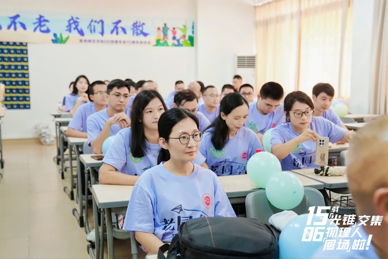 熟悉的教室见证了久别重逢的喜悦。校友们在签名墙上郑重留下姓名,笔尖流转间是对青葱岁月的深情回望;身着印有“06物理”字样的定制文化衫,仿佛瞬间唤醒了珍藏的同窗记忆。师生围坐畅谈,当年课堂上的热烈讨论、实验室里的专注身影、毕业季的依依惜别,都化作此刻的欢声笑语,在教室中流淌。