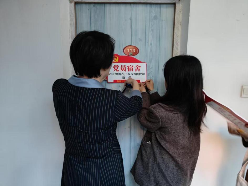 本次活动以“一名党员一面旗帜,一间宿舍一个样板”为导向,为全院学生党员所在宿舍统一悬挂“党员宿舍”标识牌,主动亮明身份,自觉接受监督。挂牌既是荣誉,更是责任。学院党委书记吴丽双在走访挂牌宿舍时指出:“党员宿舍不仅要做到环境整洁、学风优良,更应在思想引领、行为规范、团结互助方面树立标杆,于日常点滴中展现党员的先进性。”