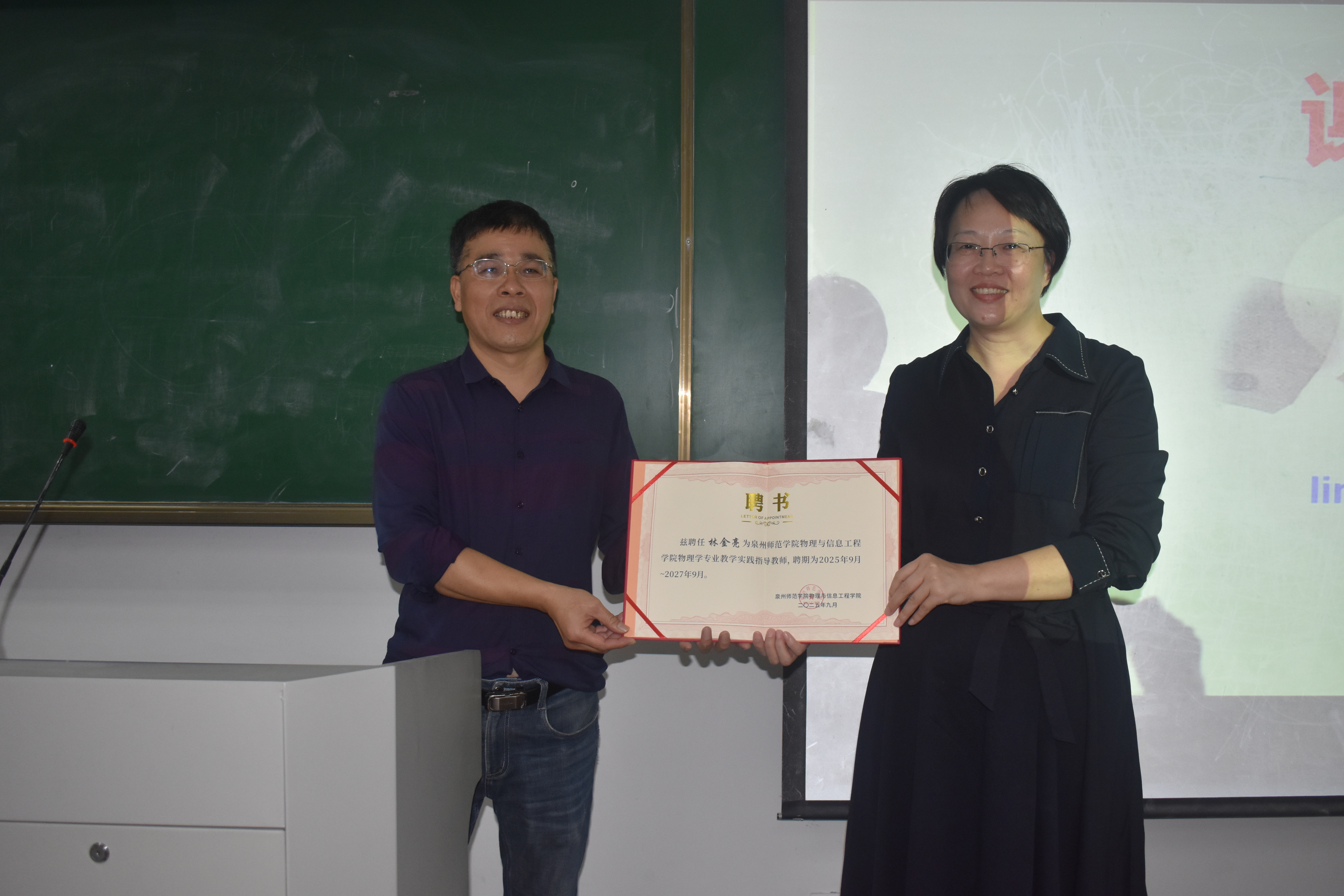 导论课结束后,吴丽双代表学院向林金亮颁发聘书,正式聘请他为物信学院物理学专业教学实践指导教师。