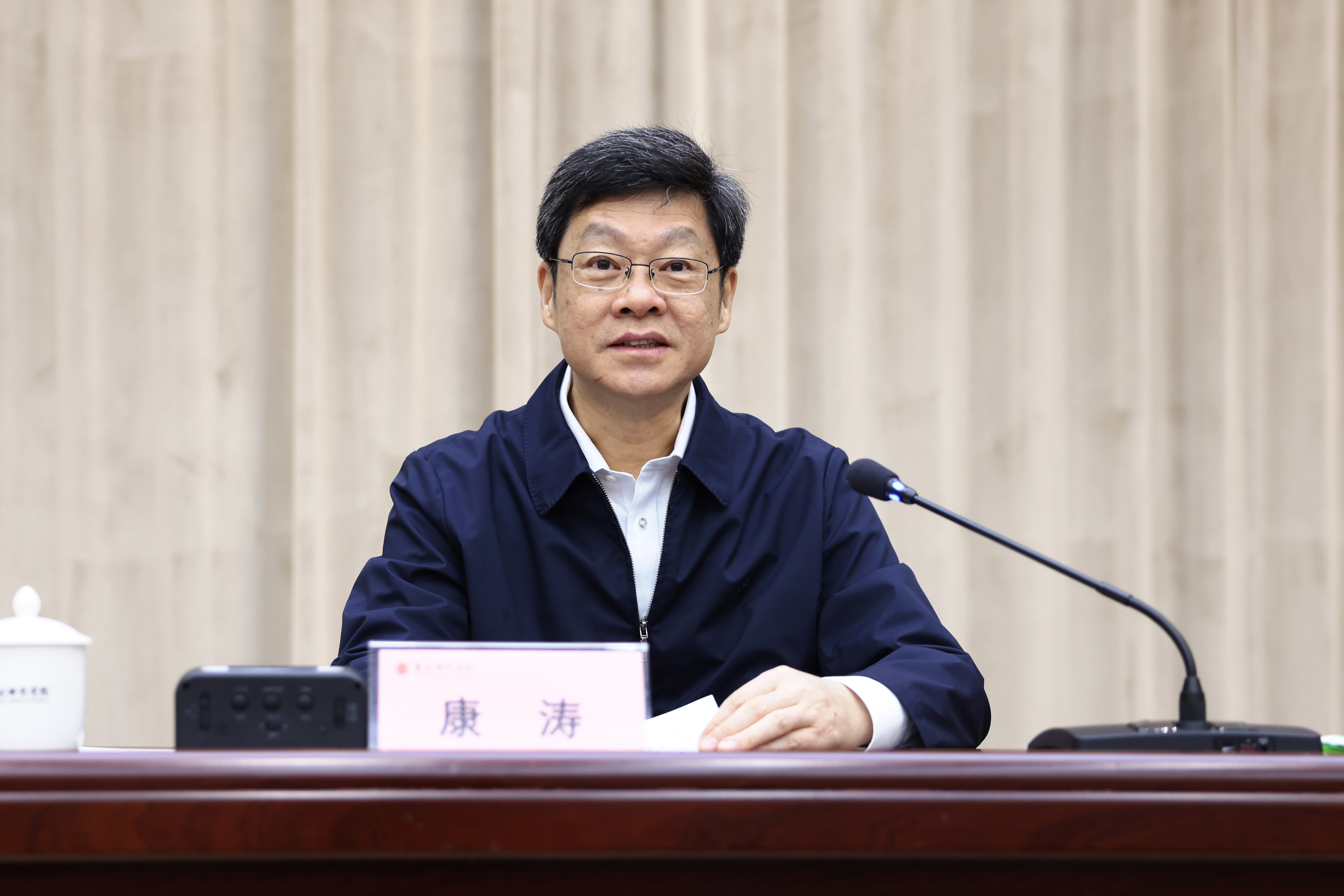 12月12日,省政府党组成员康涛莅校调研指导,宣讲党的二十届四中全会精神,并为师生讲授思政课。