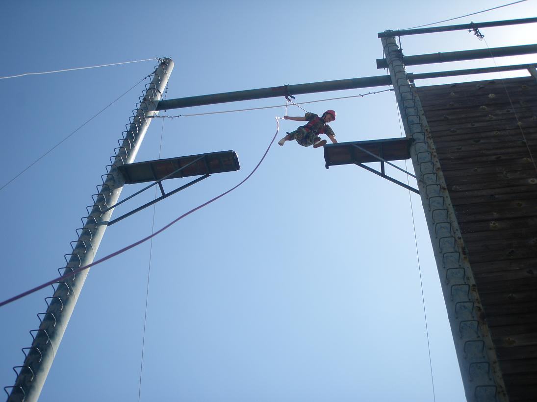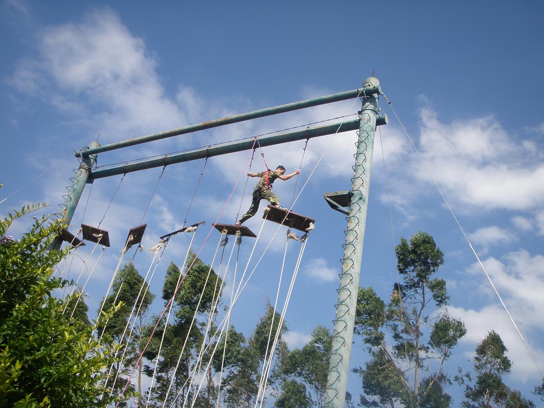 抵达目的地后,在宝山训练基地严教官的指导下,全体同学在规定时间内换好军装,并在简单的军训过后被随机分成四小队。然后,训练进入团队建设环节。严教官组织大家选出队长和副队长,要求各队在15分钟内确定队名、口号和队形,并以比赛的形式进行团队展示。各队高昂的士气让训练进入第一个高潮。接下来的项目,四队成员兵分两路,先后体验了跨越断桥、合力过桥两个高空项目。跨越断桥是个人项目,受训者要在