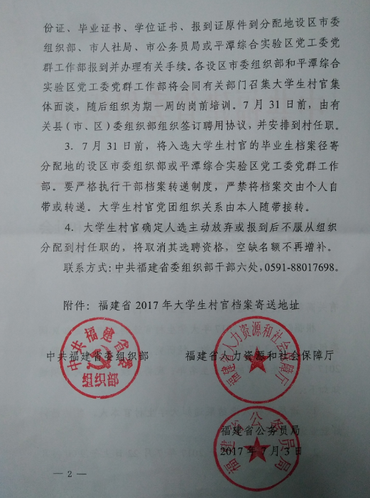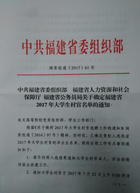 关于确定福建省2017年大学生村官名单的通知