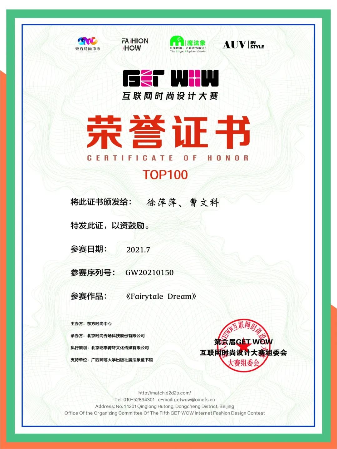 (5)2021年7月,获得“第六届GETWOW互联网时尚设计大赛”入围奖。