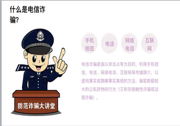 在活动中,团支书牛菁、副团支书王敏从“什么是电信诈骗”、“电信诈骗的常见形式”、“如何防范电信诈骗”以及“被骗后的补救措施”四个方面向同学们科普预防电信诈骗的相关知识。