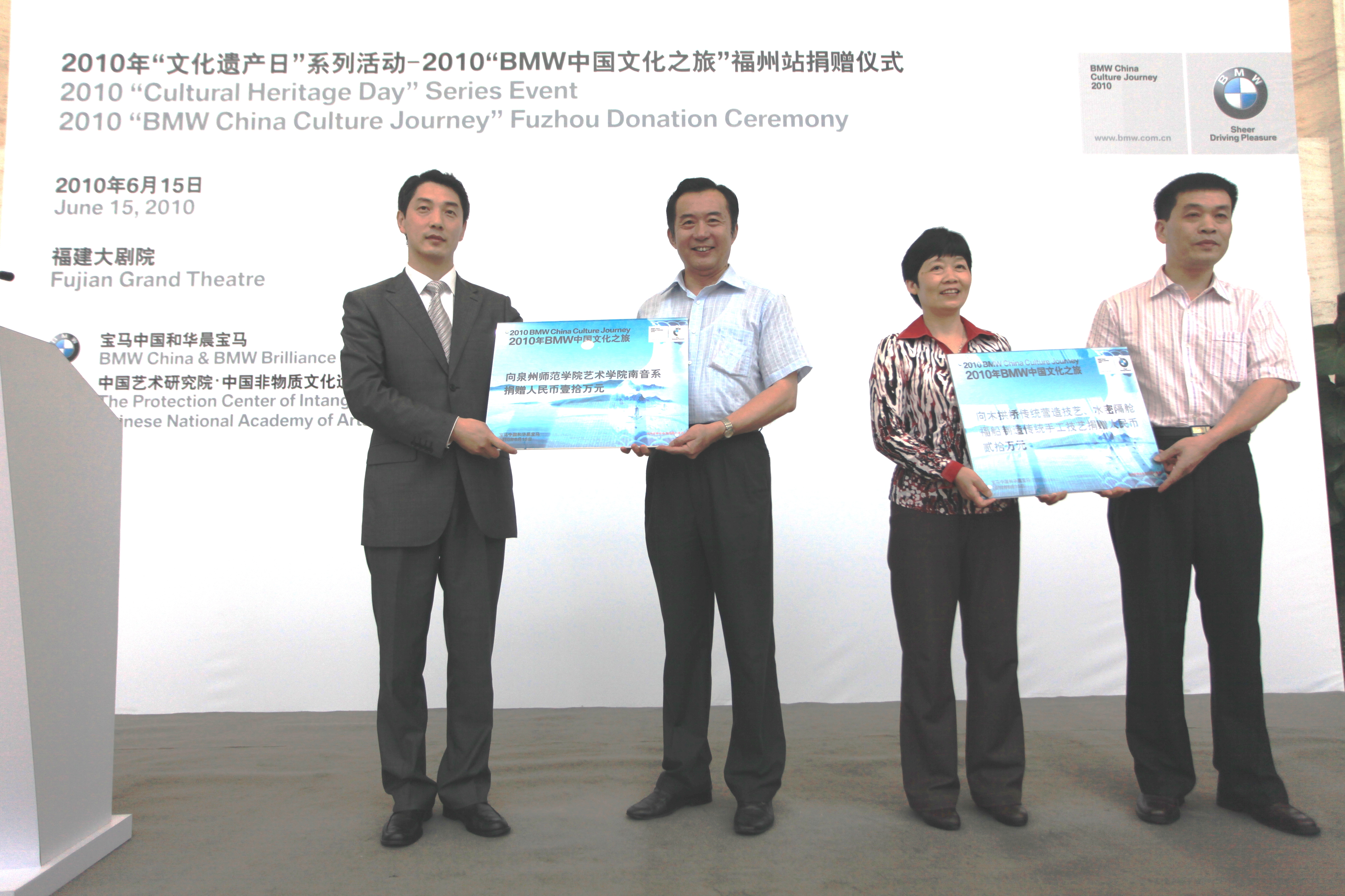 2010年“BMW中国文化之旅”重点探访福建省的闽南文化、客家文化、妈祖文化等在海峡两岸都具有广泛影响力的文化内容,对我院南音系“海峡两岸南音传承比较研究”课题进行资助,也旨在推动海峡两岸民族文化的传承,同时也为了积极响应文化部“非遗进高校”的号召。本次受捐赠的还有木拱桥传统营造技艺和水密隔舱福船制造传统手工技艺两项非物质文化遗产项目。南音被音乐学界认为是“中国音乐的活化石”,其悠久的音乐历史和多元的文化特征,入选了《人类非物质文化遗产代表作名录》。南音不仅具有很高的学术研究价值,而且还在港台、东南亚地区广为流传,是海峡两岸同根同源的文化见证,也是维系全球华人情感的重要纽带。此次BMW希望通过宝马爱心基金对南音相关研究课题的资金捐赠,为促进海峡两岸的文化认同作出贡献。