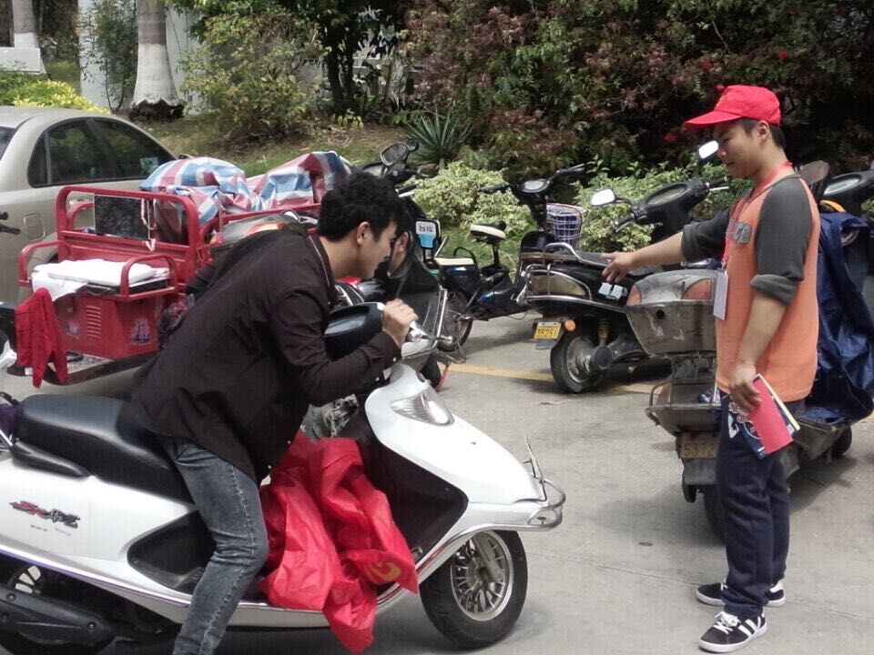 2015年3月27日中午十二时许,由音乐与舞蹈学院团委会和学生会各部门成员组成的志愿者团队,分别在一餐、三餐附近对校内来往的机动车辆进行文明督导,并精心制作小标识,提醒非法停靠车辆的车主下次要文明停车。当时正处于下课高峰期,车流量、人流量多,再加上气温骤增,空气闷热,志愿者的工作相当不易。好在大部分车主都能积极配合,这让志愿者们觉得收获颇丰的同时心生慰藉。