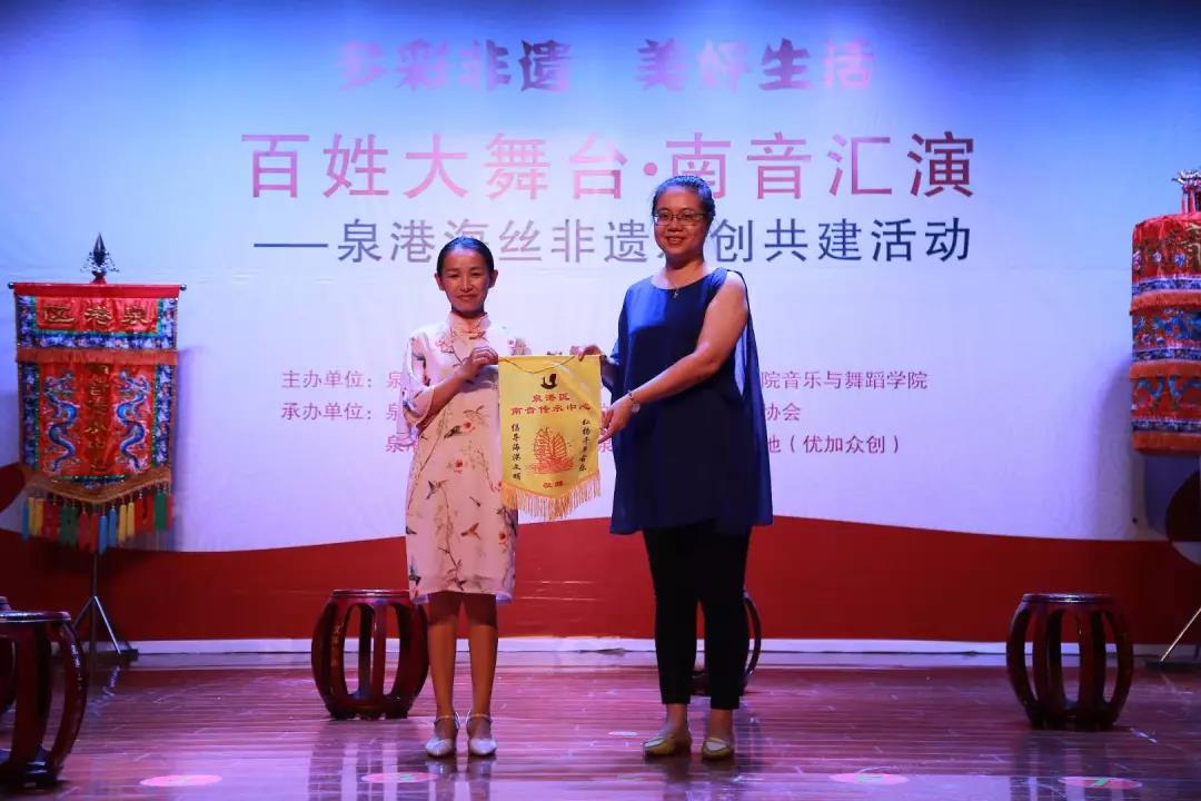泉师音舞团委副书记刘晓莹老师与泉港区南音传承中心老师互赠锦旗