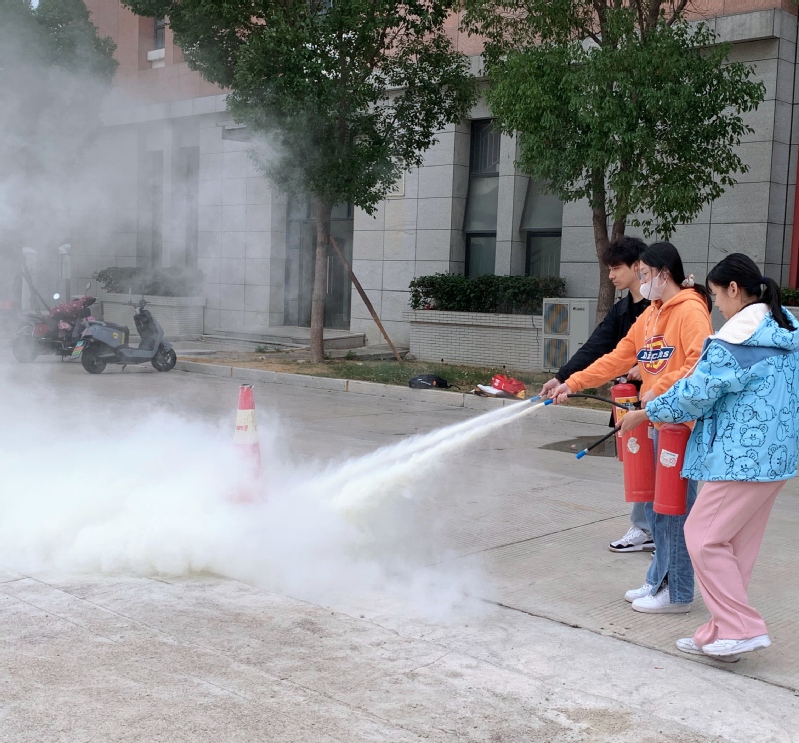 演练过程中,辅导员李祖阳详细地介绍了灭火器的相关知识,同时也为在场学生示范如何正确使用灭火器。随后,同学们在保卫处工作人员的指导下亲身实践灭火。