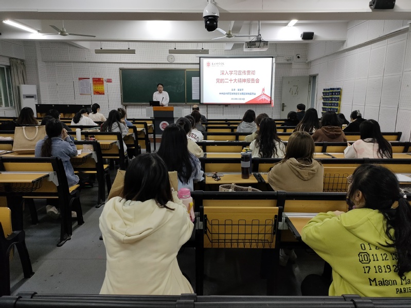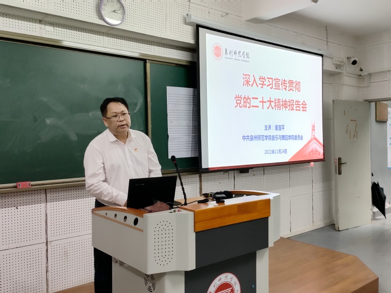 为深入学习贯彻党的二十大精神,11月24日,音乐与舞蹈学院邀请中共泉州市委讲师团四级调研员、副教授童宝平来校作《深入学习贯彻党的二十大精神》专题辅导报告,音乐与舞蹈学院党委书记苏国柱,副书记兼纪委书记胡秋娇,全体师生党员、入党积极分子出席报告会,会议由胡秋娇主持。