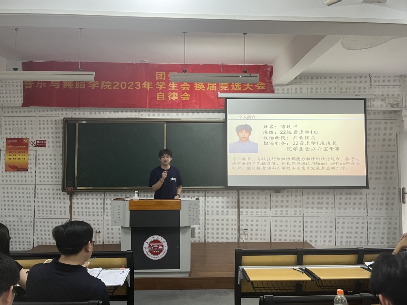 各位竞选者分别上台进行自我介绍、竞选宣言和竞选岗位规划。竞选演说环节结束后,刘晓莹老师作了总结发言,她对竞选人员表示赞许和鼓励,希望他们能继续保持初心,全心全意为同学服务,用最饱满的热情、最踏实的工作态度和最务实的责任心继续为音乐与舞蹈学院的学生工作增光添彩!