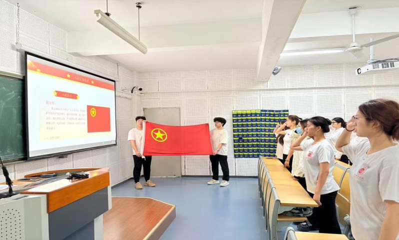 仪式在雄壮的国歌声中拉开序幕,全体成员庄严肃立,齐唱国歌。现场气氛庄重,嘹亮国歌声结束后,新团员共同进行宣誓。