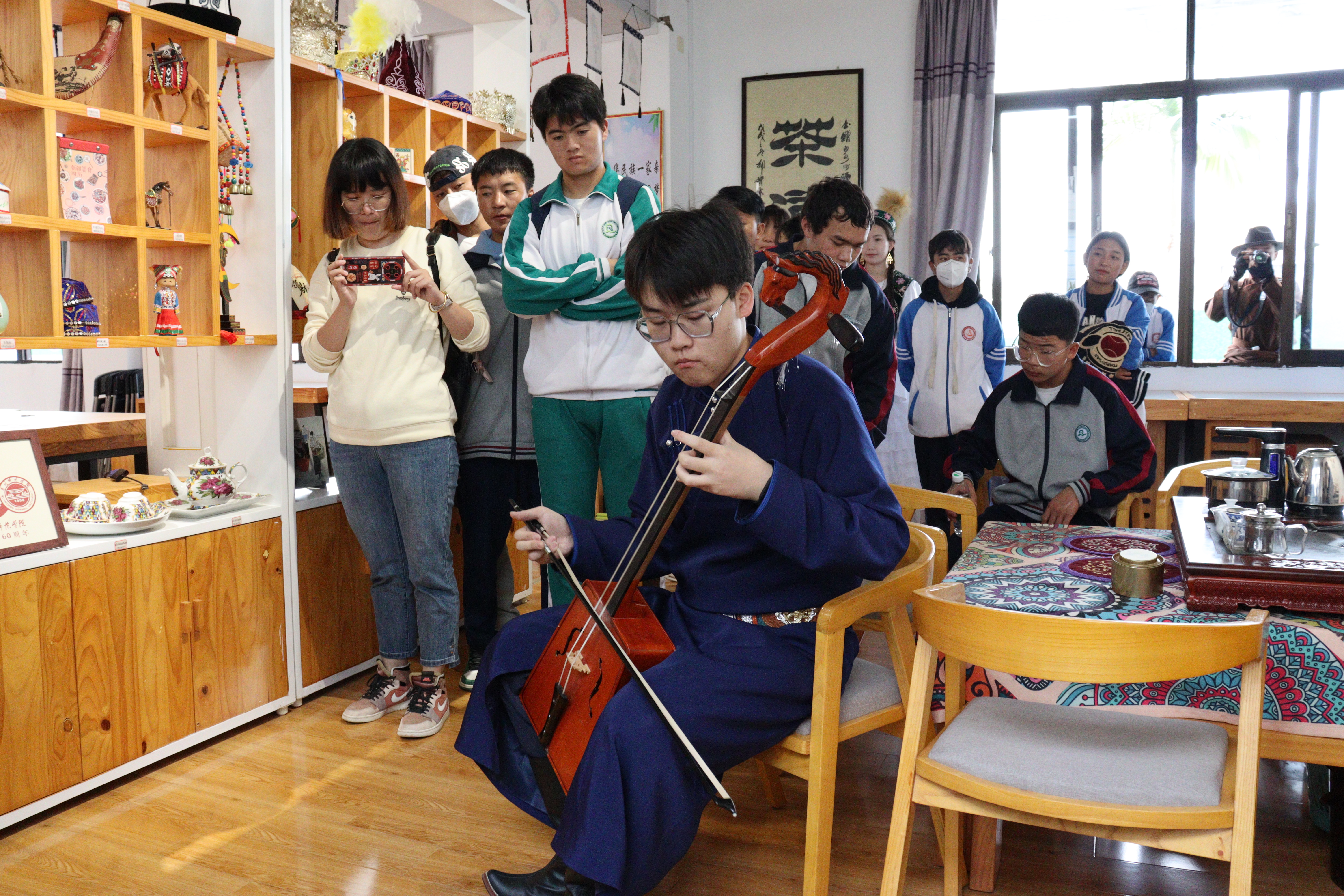三所中职中专学校的民族学生在我院大学预科生带领下,参观了我院的爱国华侨陈水俊学生纪念馆,了解陈水俊先生的生平事迹,感受陈水俊先生的爱国之情。走进欧阳詹读书亭,了解在南安校区后山高盖山求学过的唐代文学家欧阳詹的求学故事,感受闽南第一位进士的诗词魅力。在民族工作室里,我校的民族预科生为研学的中职中专学生讲述各自民族的历史、风情及民族团结故事,并邀请他们参观陈列于此的民族服饰、乐器、手工艺品等。参观过后,我院的内蒙古学生在民族工作室演奏了特色乐器马头琴,身着传统民族服饰的新疆同学也表演了维吾尔族舞蹈和哈萨克族民族舞蹈,随后研学学生也跳起了自己民族的特色舞蹈,现场一片欢乐,气氛热烈,研学的中职中专学生们通过沉浸式互动项目感受了我院浓厚的民族团结氛围和多姿多彩的民族优秀文化。