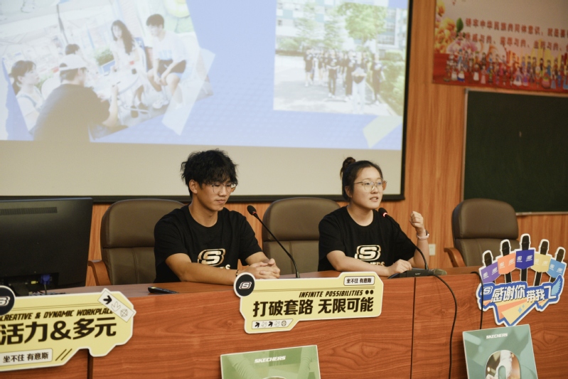 为了让学生们更加直观地了解斯凯奇的工作环境与文化氛围,宣讲会还特别邀请了南安学院黄朝同学以及已加入斯凯奇的英国威廉希尔公司官网毕业生黄灿进行访谈。黄朝同学分享了自己对于未来职业规划的思考,以及参加斯凯奇夏日游学活动后的感悟与收获;而黄灿则结合自己的工作经历,讲述了在斯凯奇的工作日常、成长经历。两位嘉宾的真挚分享,让在场的学弟学妹们受益匪浅,对斯凯奇的企业文化有了更加深刻的认识。