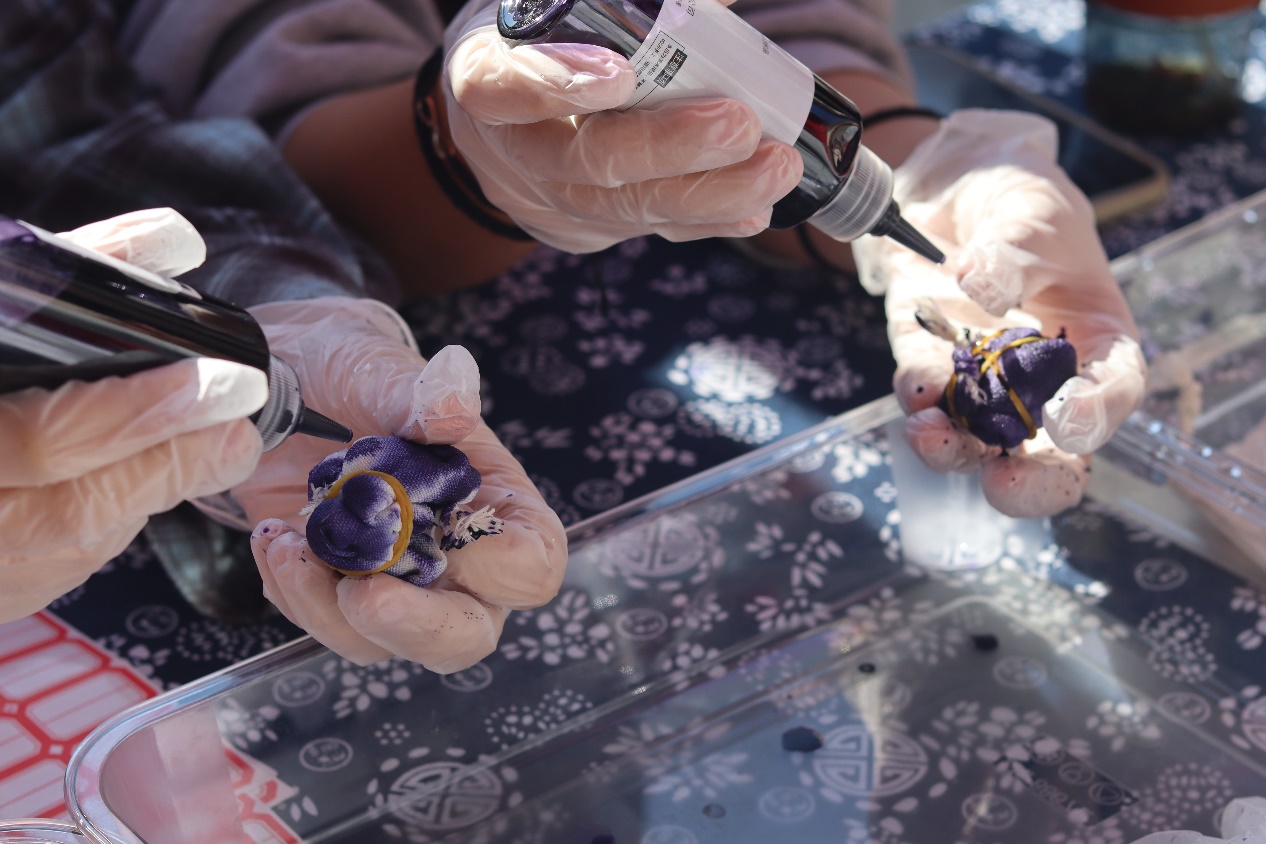 非遗扎染体验环节中,同学们通过纱、线、绳等工具,对织物进行扎、缝、缚、缀、夹等多种形式组合后染色,创造出独一无二的艺术作品,呈现出中华优秀传统文化的瑰丽之姿,这两种传统艺术的结合,不仅让学生亲身体验了中华优秀传统文化的魅力,也在实践中增强了对非遗文化的理解与传承意识。