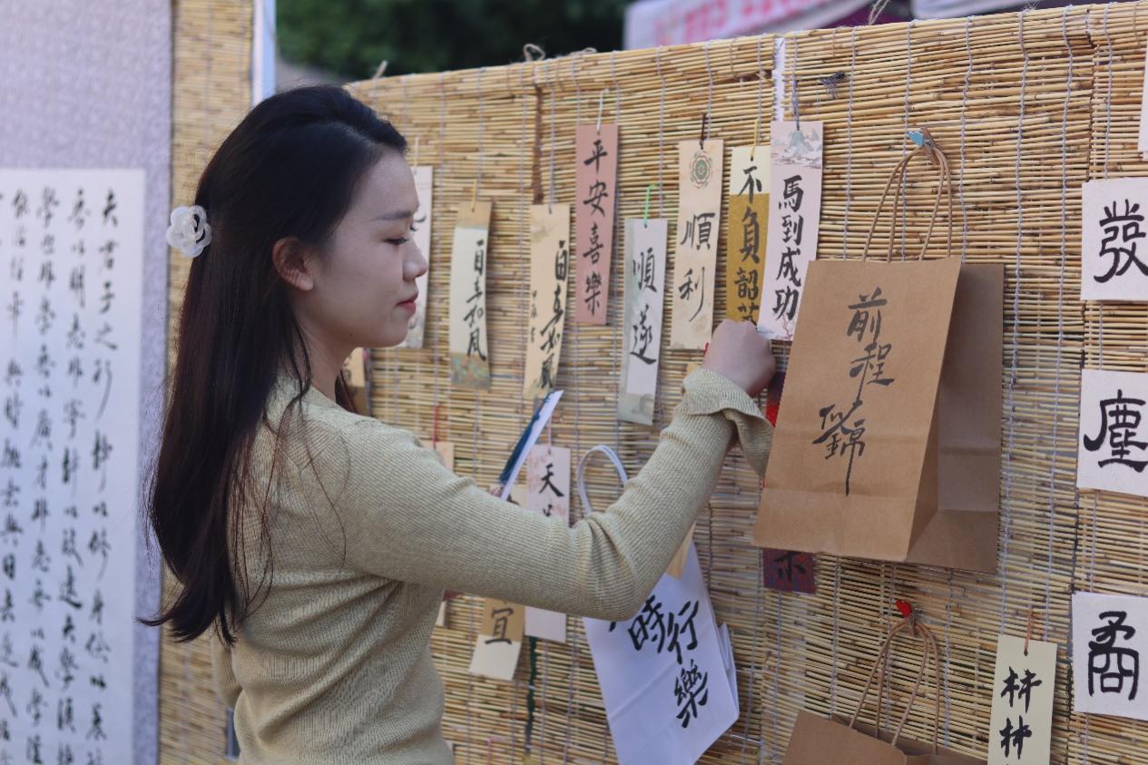 在“笔墨临古”书法体验环节中,不少同学聚集于抽奖箱前“探筹抓阄”,获得了自己的祈福书签,或亲自上前挥毫泼墨,体会汉字的力与美。软笔凝聚浓厚墨汁,缓慢渗透于纸上,在熟练有力的运笔之下呈现出饱含真情的祝愿,希望能够在考场中一举夺胜、金榜题名,不负日夜磨炼的光阴。