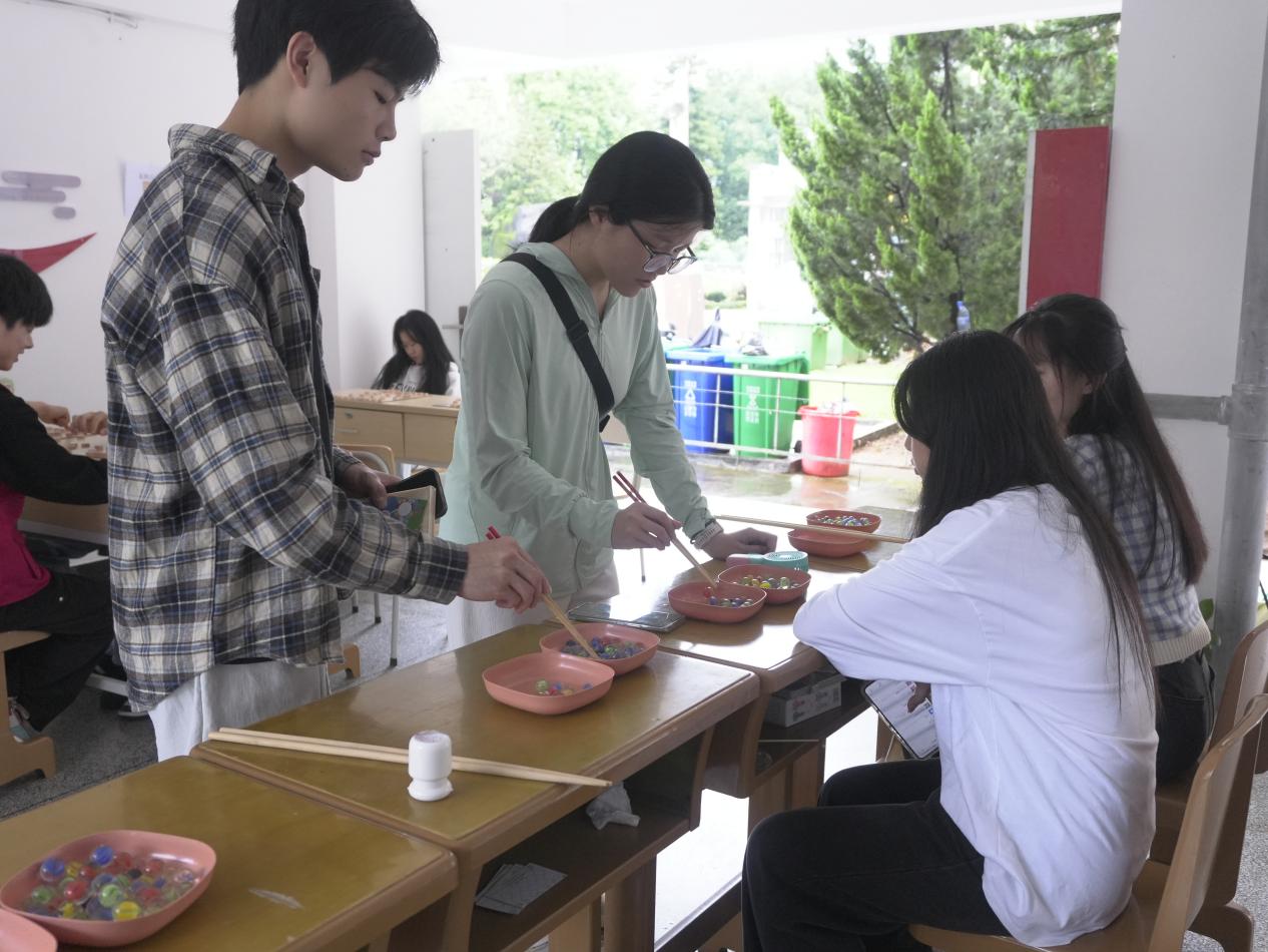 本次游园会巧妙融合心理教育与趣味游戏,设置了多项互动环节:在振华楼举办的「筷乐夹击」活动中,同学们组队进行一分钟筷子夹情绪球竞赛,并在竞技中分享克服困难的经历。快速滑动的彩球象征多变情绪,团队间的默契协作则生动诠释了应对压力的智慧。