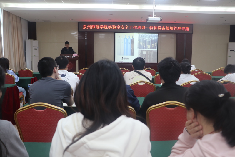 为深入贯彻落实高等学校实验室安全管理规范,进一步加强学校实验室安全工作,切实提高特种设备规范化、科学化管理水平,4月11日下午,学校举办实验室特种设备安全使用管理专题培训。福建省特种设备检验研究院(泉州分院)劳安设备技术开发有限公司泉州分公司经理王锦温高级工程师应邀作专题讲座,学校实验室安全督导组、资产与实验室管理处及各相关学院(系)实验室特种设备管理人员和师生代表参加了培训,培训会由资产与实验室管理处副处长主持。