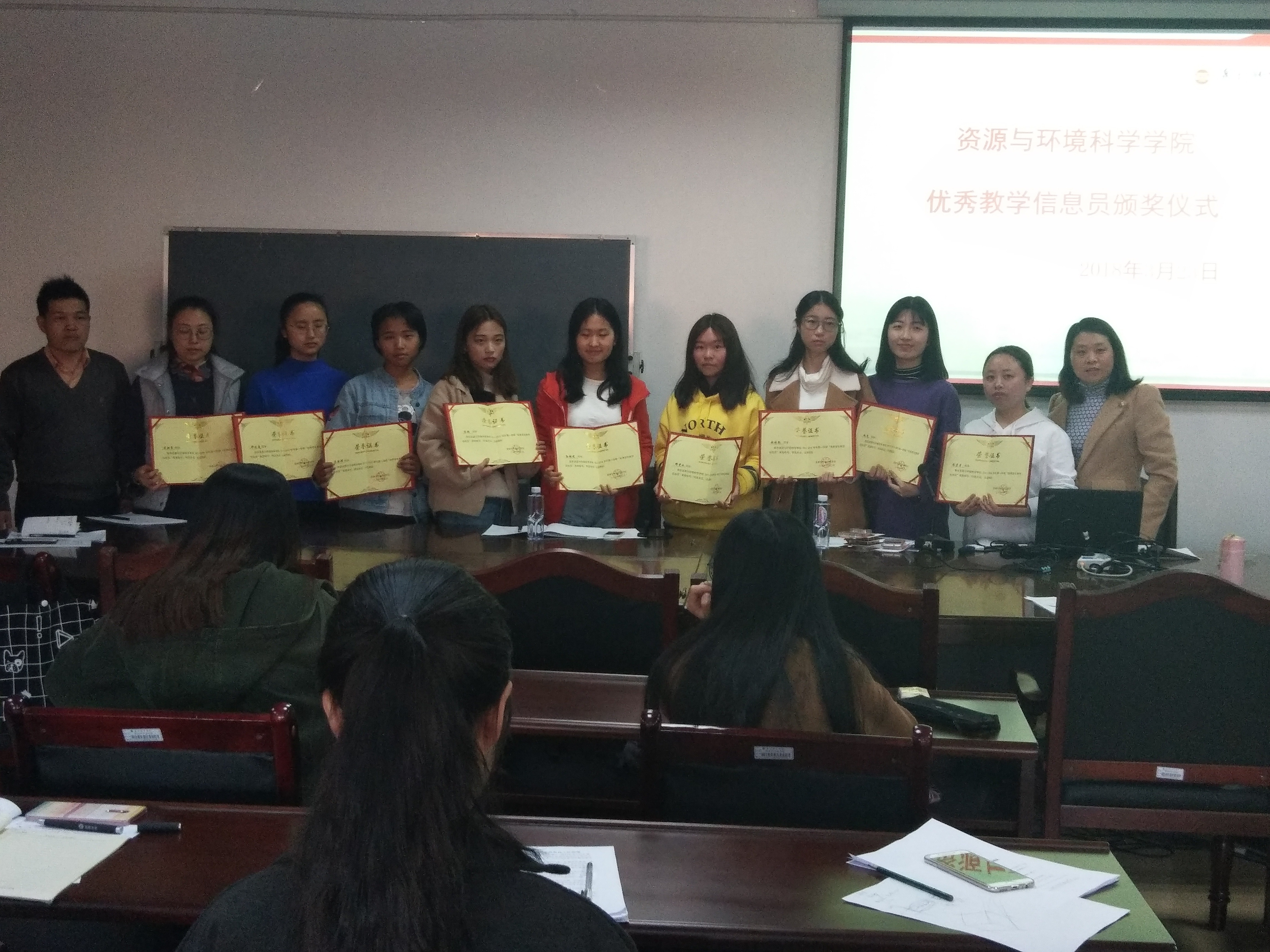 然后,进行了2017秋学期优秀学生教学信息员颁奖仪式,李老师和曹老师共同为上学期的优秀教学信息员孙颖君等九位同学颁发了荣誉证书和奖品,肯定了他们在工作中的优异表现,希望他们再接再厉,继续努力,也希望其他信息员以他们为榜样,认真工作,共同为学院教学管理工作贡献力量。