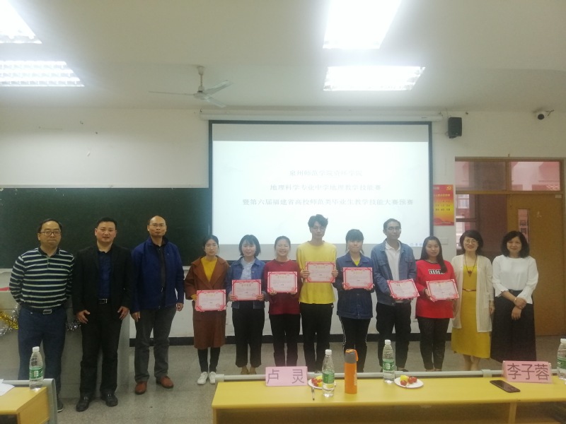 4月20日资环学院在荣茂楼成功举办了地理教学技能大赛暨第六届福建省高校师范类毕业生教学技能大赛预赛。在李子蓉院长领导下,地理科学专业主任黄初龙教授和16级地理科学班策划组织了此次赛事,由泉州五中卢灵特级教师和我院李子蓉教授、陈大涌、康伟锋、黄初龙等老师组成评委,比赛结果林宇晨同学荣获一等奖,陈恋芹和张惊丽同学荣获二等奖,另有三等奖获得者多名。地理科学专业各年级部分同学们观摩了此次赛事。
